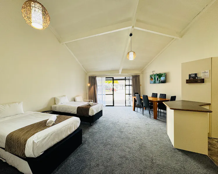 Perfect for larger groups or families, this spacious room features one queen bed and four single beds, accommodating up to six guests. Enjoy modern comforts with air-conditioning in both the queen bedroom and the lobby. The room includes a full kitchen with a dishwasher, cooking facilities, crockery, cutlery, and kitchen supplies. Complimentary tea, coffee (including decaf), hot chocolate, sugar, and milk are also provided. Relax with bathroom amenities such as shower gel, hand wash, soap, toilet paper, towels, and a hairdryer. Guests also have access to the mineral thermal pool. A cot can be requested if needed (subject to availability).