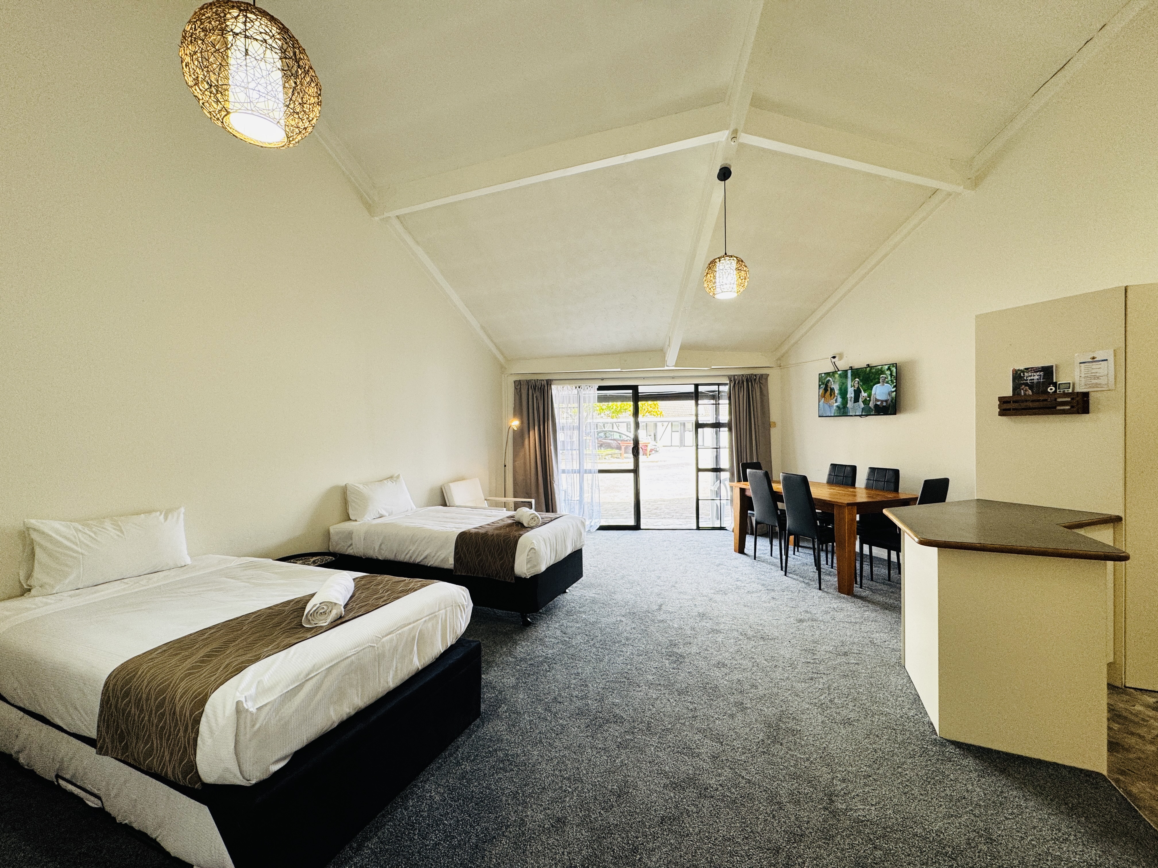 Perfect for larger groups or families, this spacious room features one queen bed and four single beds, accommodating up to six guests. Enjoy modern comforts with air-conditioning in both the queen bedroom and the lobby. The room includes a full kitchen with a dishwasher, cooking facilities, crockery, cutlery, and kitchen supplies. Complimentary tea, coffee (including decaf), hot chocolate, sugar, and milk are also provided. Relax with bathroom amenities such as shower gel, hand wash, soap, toilet paper, towels, and a hairdryer. Guests also have access to the mineral thermal pool. A cot can be requested if needed (subject to availability).