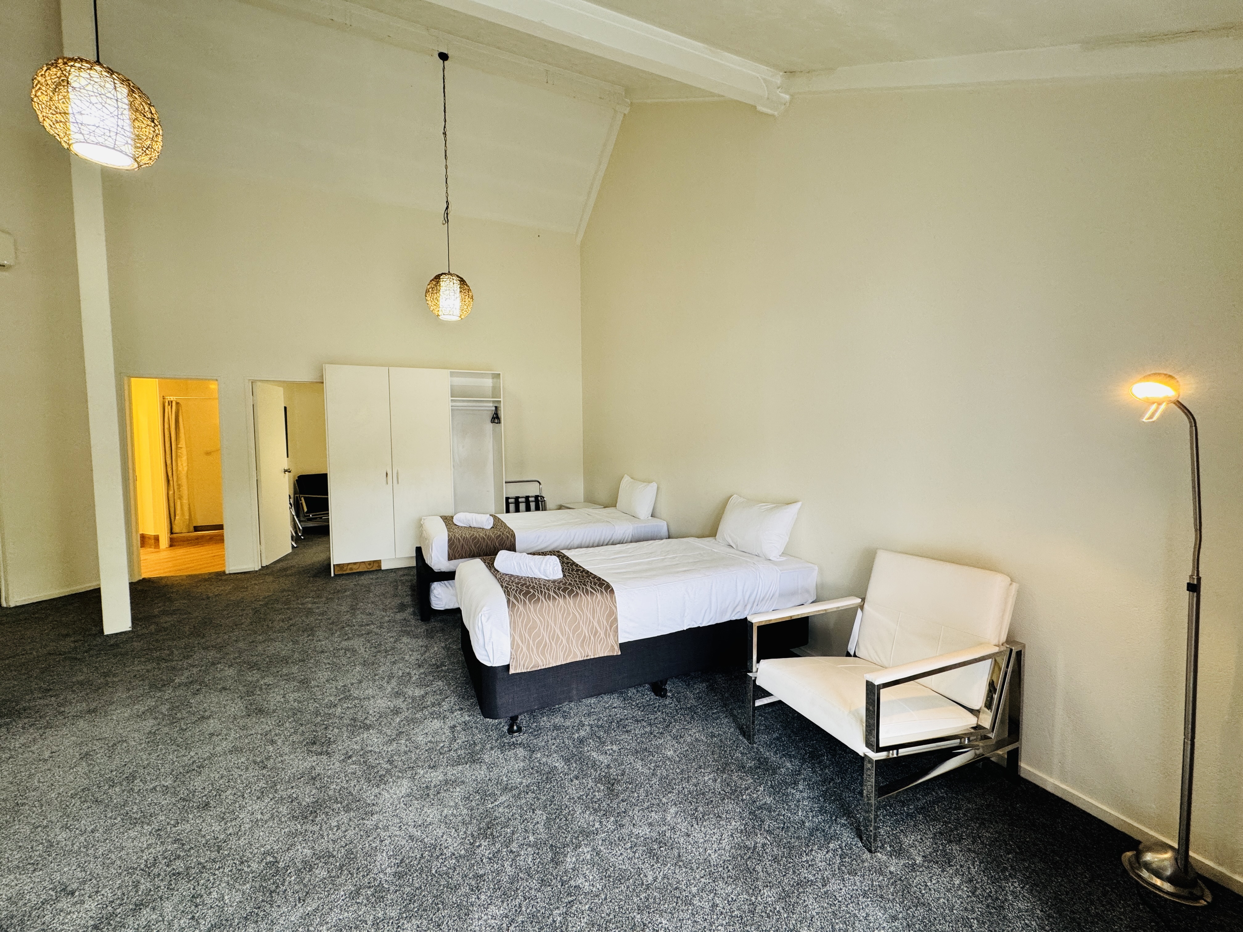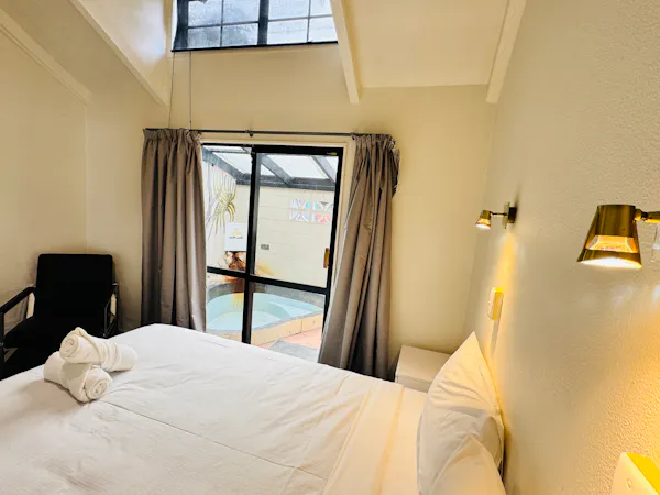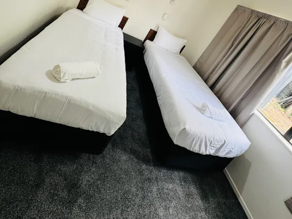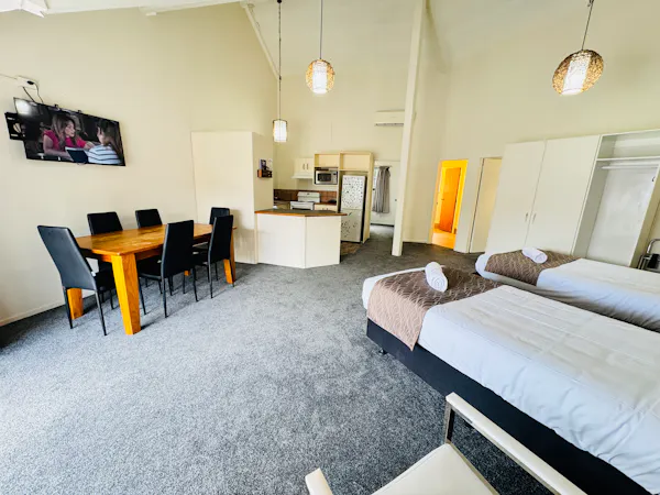 Perfect for larger groups or families, this spacious room features one queen bed and four single beds, accommodating up to six guests. Enjoy modern comforts with air-conditioning in both the queen bedroom and the lobby. The room includes a full kitchen with a dishwasher, cooking facilities, crockery, cutlery, and kitchen supplies. Complimentary tea, coffee (including decaf), hot chocolate, sugar, and milk are also provided. Relax with bathroom amenities such as shower gel, hand wash, soap, toilet paper, towels, and a hairdryer. Guests also have access to the mineral thermal pool. A cot can be requested if needed (subject to availability).