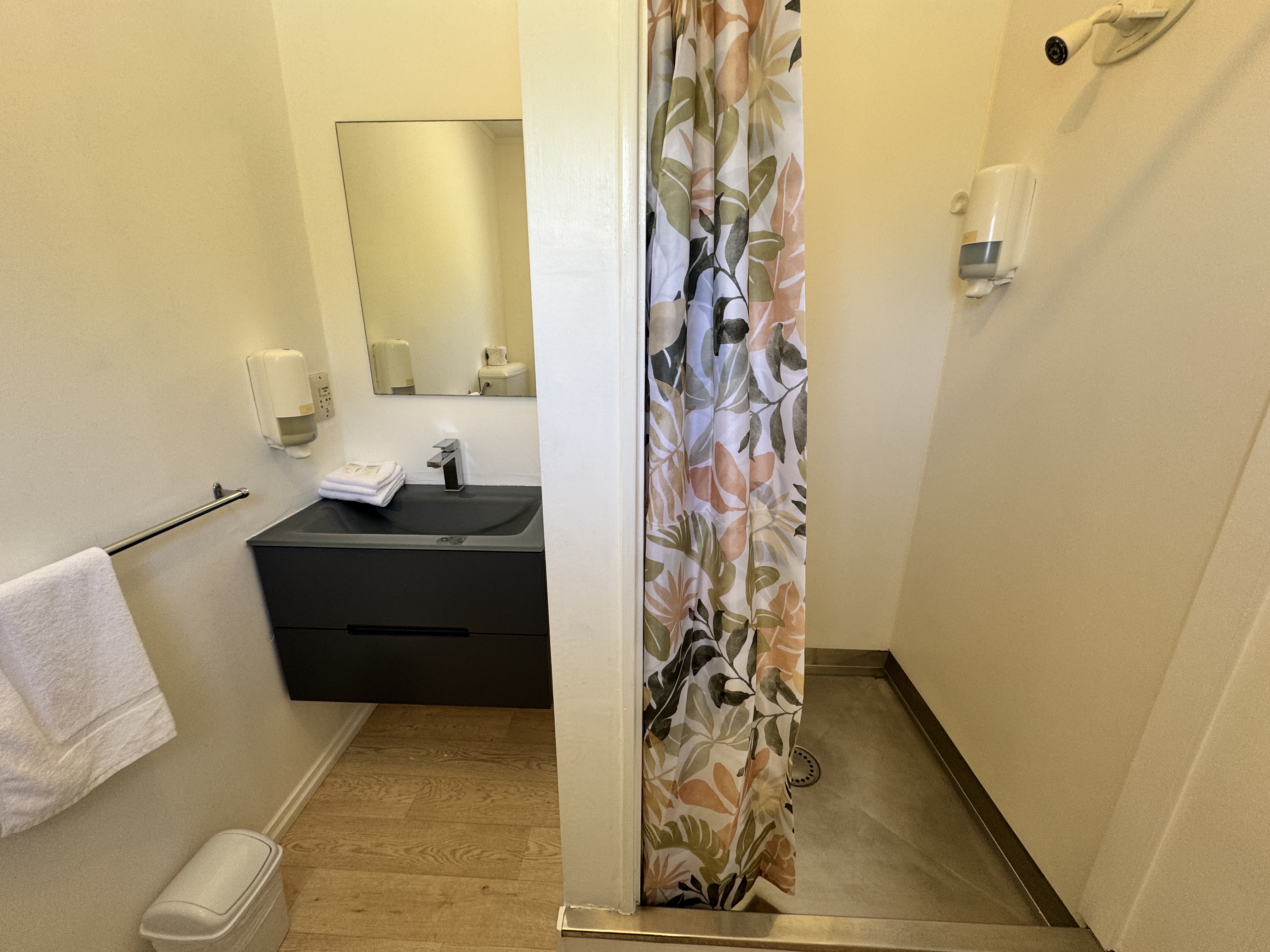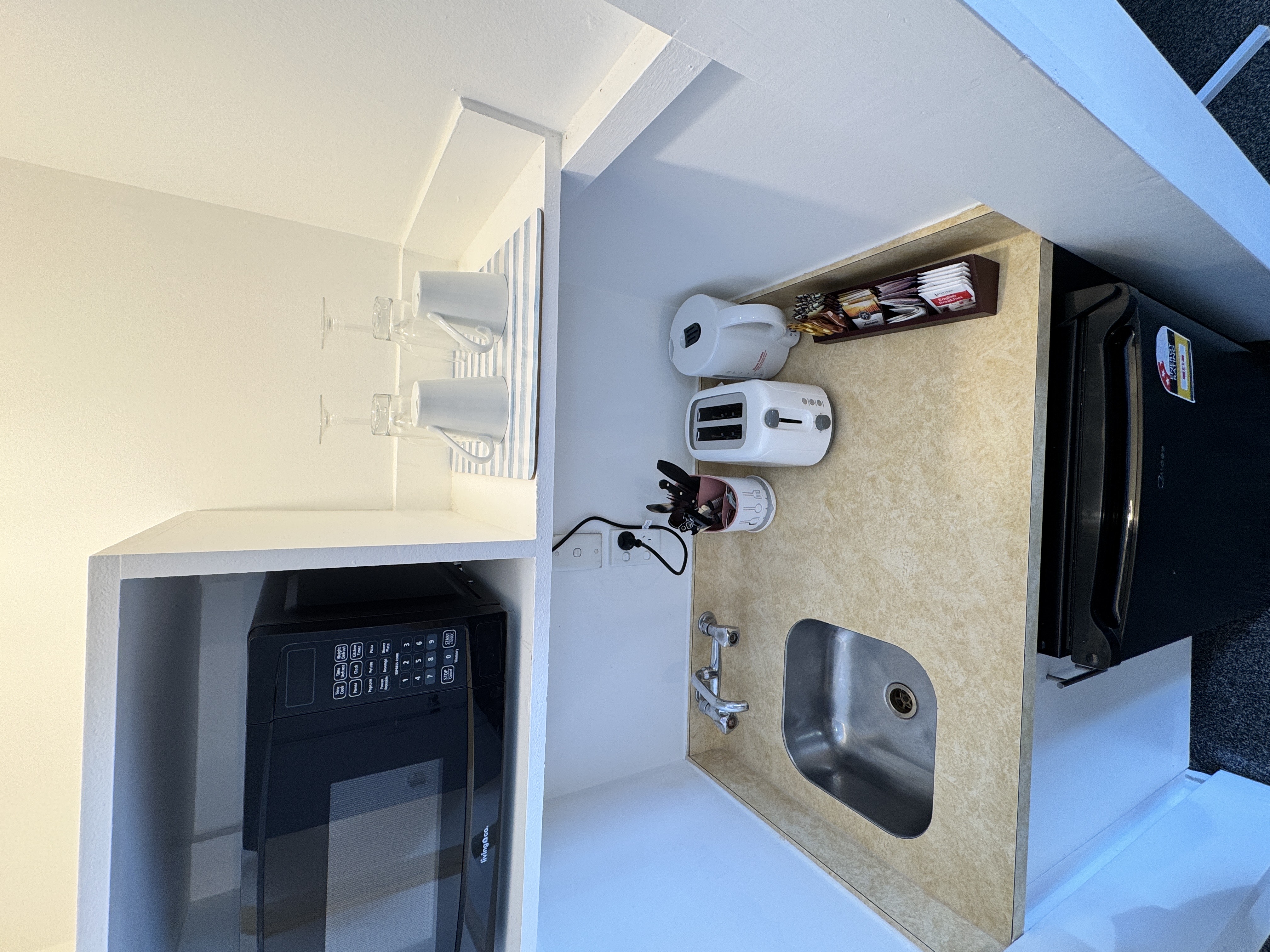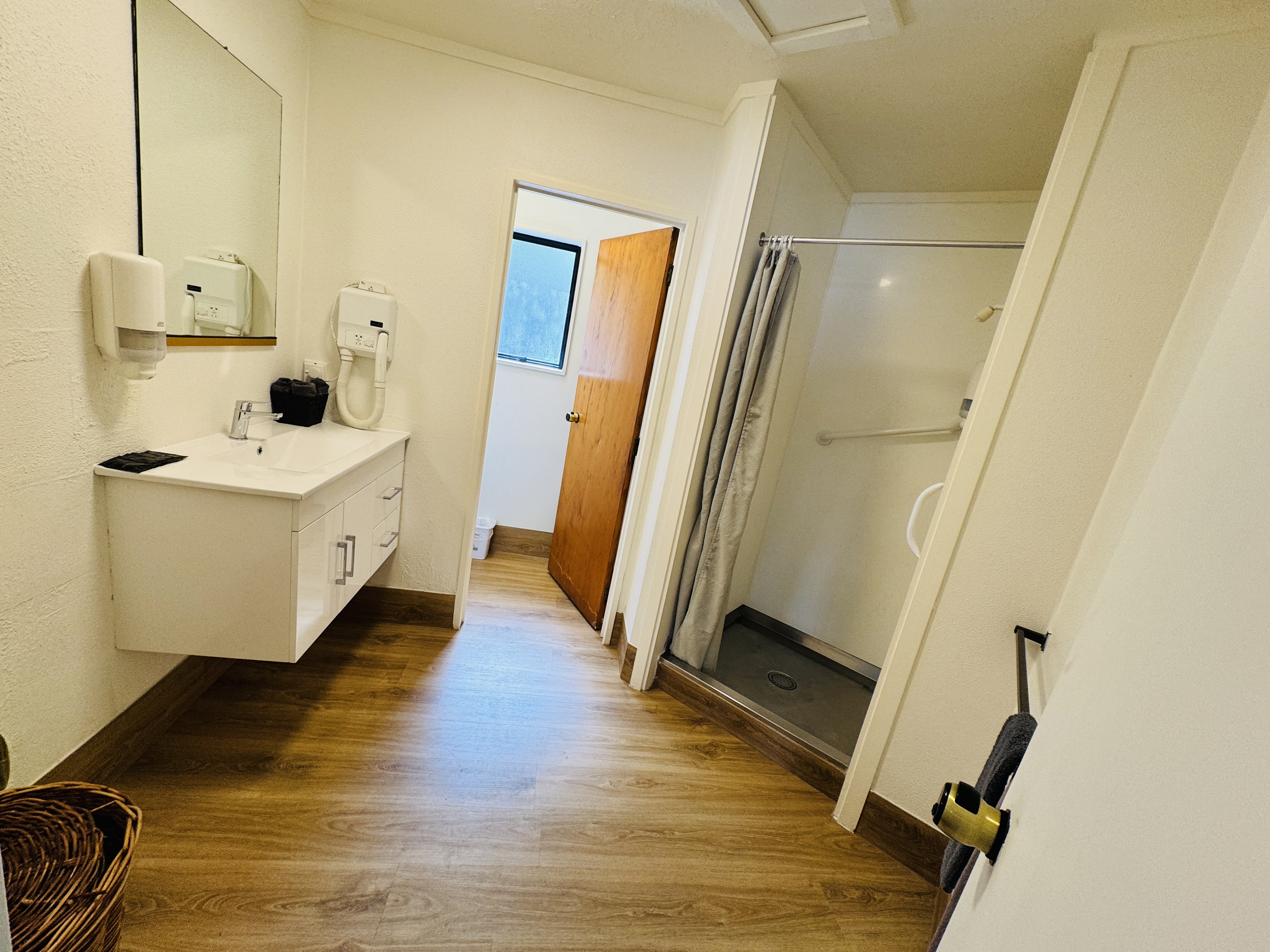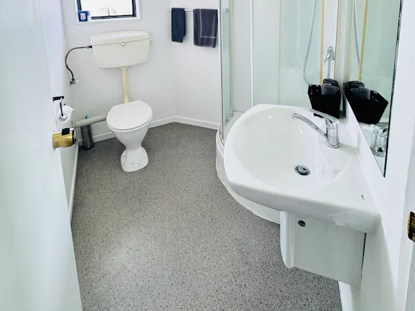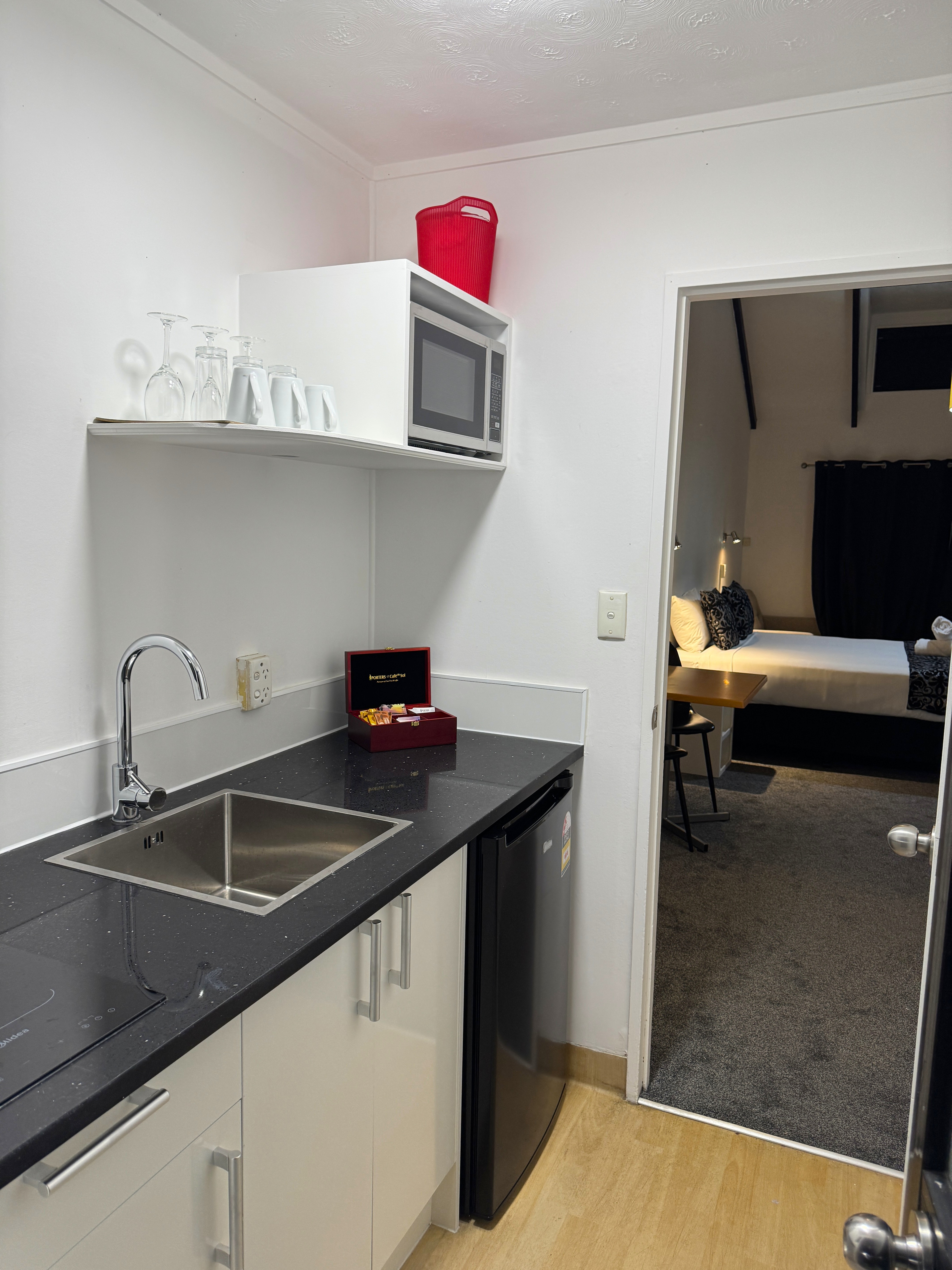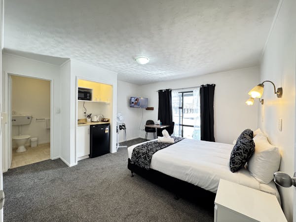 This suite accommodates 1-2 guests with one queen bed. In-room amenities including fan, heater, shower, and a small kitchenette with microwave, kettle, toaster and basic cutlery and cookery. Complimentary tea, coffee (including decaf), hot chocolate, sugar, and milk are provided for your convenience. The Private bathroom is stocked with shower gel, hand wash, soap, toilet paper, towels, and a hairdryer, ensuring a comfortable and relaxing stay.
